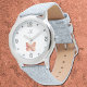 Butterfly silhouette in rose gold appearance on white background. Arabic numerals and dots adorn the watchface. Add a monogram to this girly design right now.