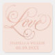 Seal your wedding favors with romantic elegance using this rose gold love script monogram square sticker. Ornate "Love" calligraphy in rose gold is paired with the couple's names and wedding date on a soft blush pink background. The warm metallic script against the feminine blush palette creates a dreamy, sophisticated accent. Perfect for favor bags, gift boxes, or wine bottles. All text is fully customizable.