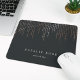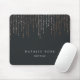 Chic personalized mousepad displays your name, business name or choice of custom text in classic white lettering on a rich soft black background with vertical strands of faux rose gold foil string lights cascading from the top.