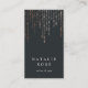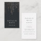 Simple and elegant vertical business card design features classic white lettering on a rich soft black background with vertical strands of faux rose gold foil string lights cascading from the top. Personalize with two lines of custom text on the front, and add your full contact information to the reverse side.