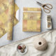 This wrapping paper features a glossy, stylized image of a Christmas tree accompanied by "Happy Holidays" text. The background consists of square tiles designed in gold and rose gold hues.