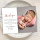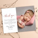 Elegant Modern Rose Gold Script Photo Newborn Baby Thank You Postcard. Featuring a beautiful "thank you" text in a cursive whimsical hand-lettered calligraphy swash tail font script in faux rose gold foil (or blush pink foil) and pre-made personal message great for baby girl. Easy to personalize with your baby photo and details.