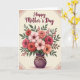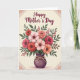 This greeting card features a large bouquet of stylized flowers rising from a gently curved vase in deep plum, set against a soft ivory background. The blossoms range from blush pink and peachy coral to rosy red and deep crimson, with shaded petals that feel like they’re leaning in close together, like friends sharing a quiet moment ❤️. Dark, detailed flower centers add contrast, while olive-green leaves and small reddish berry clusters fill out the arrangement with a cozy, natural look. A simple twine bow is tied around the vase neck, adding a sweet, down-to-earth touch. A rounded border in pale rose-gold surrounds the scene, with delicate lace-like corner details that give it a soft, romantic edge 🌼. Near the top, a short message sits above the bouquet in flowing burgundy lettering, centered and easy to spot. The border has a gentle sheen, and the lace-like accents trace the corners and edges in fine, pale lines.