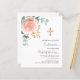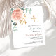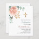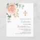 Rose gold and blush pink florals, eucalyptus greenery and a golden cross. Personalize and add a name and details.