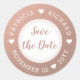 Trendy save the date stickers with a rose gold frame.Personalize with date and couple names.