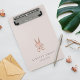Chic personalized clipboard for your salon or hairstyling business features two lines of custom text in classic gray lettering, on a pale blush pink background adorned with a pair of flower-embellished scissors in faux rose gold foil. Design repeats on reverse side. Please note that this clipboard is a mini size; full size version also available in our Rose Gold Floral Scissors salon collection.