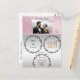 The embossed silver floral holds information you wish to convey at that time. A unique gold and glitter number and a row of wavy white pearls behind the custom photo add chic to the final design.