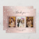 Add 3 of Your birthday photos, vertical size, a date, name, and the thank you note. A blush, rose gold background with black text and frame, a faux silver sparkles. The text: Thank you on the front and your name on the back are written with a stylish hand lettered script with swashes.