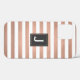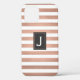 Chic iPhone case done in a rose gold and white horizontal striped pattern, with graphics of dark gray and rose gold monogram plaque, in the middle. Personalize the white one letter monogram, to suit your needs.