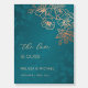 This elegant transparent wedding welcome sign features rose gold line art flowers on a teal background. Wedding quote: "the love is ours".