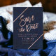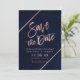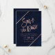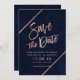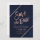 Rose Gold typography on customizable navy blue watercolor and faux rose gold geometric stripes chic save the date wedding , perfect for elegant, stylish wedding,