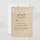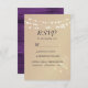 Modern, elegant typography rose gold wedding RSVP card with string lights, gold floral lace and rustic purple wood back.