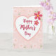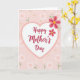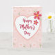 This greeting card features a soft pastel look with a blush-pink background filled with scattered floral shapes that feel gently affectionate ❤️. In the center sits a white heart outlined in a light rose line, creating a cozy frame like a warm hug. Inside the heart, the words “Happy Mother’s Day” are placed centrally in flowing crimson lettering that stands out against the white space. Around the heart, small white daisy-like flowers with pale pink centers repeat across the background, giving the scene a calm, caring rhythm. Mixed in are light pink dots and tiny star-shaped florets on thin green stems, adding delicate detail without crowding the design. Two larger multi-petaled blooms appear near the upper right, colored a deeper rose-pink with bright yellow centers, like a little flourish that draws the eye 🌼. The overall layout balances the centered heart with the off-to-the-side flowers, creating a quiet, loving closeness through the gentle colors and spacing. The upper-right flowers are the most saturated elements, with layered petals and sunny yellow accents against the blush field.