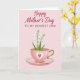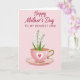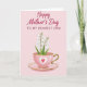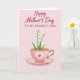 Designed with a soft blush-pink background, this card features a gentle still-life scene that feels affectionate and close ❤️. Across the top, a short Mother’s Day message sits prominently in deep rose lettering, centered and easy to read. Below the text, a pastel pink teacup with a shiny gold rim and a curved handle rests on a matching saucer, creating a cozy, shared-tea moment. On the side of the cup, a thin white heart outline wraps around a rich red heart, like a quiet sign of devotion between loved ones. Several slim green stems rise from the cup, suggesting a thoughtful gesture left on the table for someone special. The flowers are small, white, and bell-shaped, with fresh green leaves adding a spring touch 🌼. The gold accents catch the light subtly along the rim and saucer edge, and the cup’s heart motif sits clearly on the front facing the viewer. Share your Mother’s Day sentiments with someone you love, and let the soft pink cup and white blossoms do the talking.
