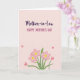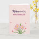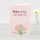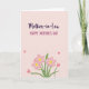 This design shows a soft, textured pale-rose background with a family greeting placed across the upper half in deep plum lettering, followed by a celebratory line beneath it in bright fuchsia. The two lines of text sit centered and roomy, letting the words breathe while keeping the focus up top. Below, a bouquet of stylized flowers rises gently, as if leaning in together like close friends sharing a quiet moment ❤️. The petals are soft pink in a few shades, each marked with fine, lighter stripes that add a tender, fabric-like look. Sunny yellow centers glow at the middle of each bloom, while leafy green stems and foliage balance the warm pinks. Small heart shapes in matching fuchsia drift around the background, adding a light romantic touch 🌼. The cluster of flowers is anchored along the bottom area, with stems reaching upward and the hearts scattered mostly around the lower and side spaces.