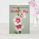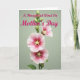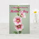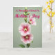 Designed with a tall floral illustration, this card shows a single green stem rising against a soft sage background, like a quiet garden moment shared with someone you cherish ❤️. Three large, cup-shaped blossoms open along the stalk, their petals shifting from deep fuchsia near the center to rosy pinks and then to pale pink and white at the ruffled edges. Each flower’s middle has a soft yellow, starburst-like detail that feels like a gentle glow, adding a tender, affectionate focus to the scene. Several small buds sit along the stem, suggesting more blooms to come, like an ongoing bond that keeps growing 🌼. Near the top, the greeting “A Thoughtful Word On Mother’s Day” is placed above the flowers in flowing pink lettering that echoes the petal tones. The lighting looks diffuse and calm, smoothing the textures and keeping the mood soft and caring without any harsh shadows. The background stays plain and muted so the flowers and message stand out clearly. The stem is slender and slightly curved, with buds clustered near the upper portion and the three blossoms spaced down the center line.