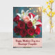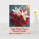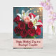 This card features a lush bouquet centered on deep crimson roses, their velvety petals opening like a loving embrace ❤️. Nestled among them are white lilies with amber-tipped stamens, adding crisp contrast and a gentle, caring feel. A single blush-pink rose sits slightly forward, like a soft reminder of closeness between family and friends. Behind the flowers, a muted teal background fades into a scatter of golden out-of-focus lights, giving the scene a cozy, celebratory glow 🌼. The light falls softly across the blooms, highlighting the smooth curves of the roses and the sharper lines of the lilies without harsh shadows. Along the lower third, a pastel pink banner carries the message “Happy Mother’s Day to a Wonderful Daughter,” set in flowing letterforms in a darker pink tone. The bouquet fills most of the center, with the golden light spots clustering more densely near the upper right.