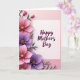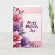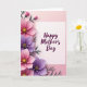 Designed with a soft, refined look, this digital artwork centers on a crisp white rectangular card set slightly off-center on a blush pink background. The message “Happy Mother’s Day” sits in the middle of the card in flowing plum lettering, drawing the eye like a gentle note passed between loved ones ❤️. A lush floral arrangement frames the card from the left and along the bottom edge, with large open blossoms in soft rose pink and calm lavender tones. The petals show subtle gradients that make them feel layered, and each flower has a bright yellow center that glows like a small shared smile. Dark green stems and slender leaves weave through the bouquet, with a few closed pink buds reaching up toward the top left, hinting at tender care and growing closeness 🌼. Soft, diffused lighting adds light shadows beneath the flowers and along the card edges, giving the arrangement a lightly raised, dimensional look. Unopened buds and thin leaves extend diagonally from the upper left corner toward the card.