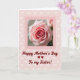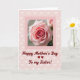 This design shows a close-up photo of a fully opened rose filling the upper half of the card, its petals shifting from pale blush at the edges to deep pink at the tightly curled center ❤️. A thin, solid pink border frames the flower, giving it a gentle spotlight against the background. Behind it, the backdrop is pastel pink with a repeating pattern of slightly lighter heart shapes scattered evenly, like a quiet chorus of affection. Soft, diffused lighting smooths across the petals, adding a faint sheen that makes the rose feel tender and inviting. In the lower portion, a flowing red message is placed beneath the photo, curving lightly as it celebrates a mother figure in a sibling relationship. The warm red lettering stands out against the pale pink, echoing the deeper tones in the rose while keeping the mood sweet and close 🌼. The hearts remain subtle and uniform, fading softly into the background around the border.