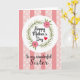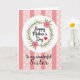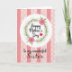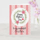 This greeting card features a white circular badge centered on the front, with the words “Happy Mother’s Day” written across it in dark, flowing lettering. A small red heart sits close to the message like a gentle kiss of affection ❤️. Around the circle, a leafy green wreath curls in a soft ring, suggesting a caring embrace. Two pink, many-petaled flowers with small brown centers rest in the greenery, adding a sweet, friendly touch 🌼. Behind everything, the background mixes pale rosy pink with alternating vertical stripes in a slightly deeper pink. Between the stripes are wider bands sprinkled with tiny white dot shapes that look like little stars. Below the circle, the line “To my wonderful Sister,” appears in matching dark lettering, centered under the main badge. The flowers sit at opposite sides of the wreath, their thin petals fanning out against the pink striped and dotted backdrop.