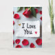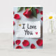 This greeting card shows a white, torn-edge note in the center with the words “I Love You” written in thick, black, kid-like writing. Two hearts sit near the note: one is a gold glitter heart that catches the light, and the other is a textured red heart that feels classic and romantic ❤️. Above the note, there’s a red rosebud with green leaves, still closed up as if it was just picked. All around the note, red rose petals are scattered like a loose frame, with some petals overlapping and some spaced out. The background is a soft gray, which makes the reds and greens stand out without feeling too busy. The whole scene feels calm and close, like a quiet moment you want to share 💘😘. It’s a sweet way to share Valentine’s Day feelings with someone you care about.
