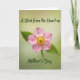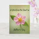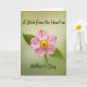 This card features a single rose-pink blossom centered on the front, with softly translucent petals that feel like they’re opening toward someone special ❤️. Fine, darker veins run through each petal, adding texture that suggests a gentle, intimate closeness. In the middle, golden-yellow stamens glow against a soft green center, drawing the eye like a warm glance shared between friends. Two deep green leaves sit to either side, their slightly serrated edges balancing the smooth curves of the flower. Behind it all is a blurred wash of muted olive and light lime tones that shifts from a creamy warmth near the top to greener shades below, creating a calm, affectionate setting. A short message appears over the floral scene in dark forest-green lettering, placed across the upper area so it doesn’t cover the flower’s center 🌼. The letters are flowing and slightly slanted, echoing the natural curves of the petals. The background fades softly from warm cream at the top into gentle green near the bottom, with the bloom remaining the sharpest detail.