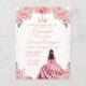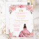This elegant and glamorous Quinceañera birthday invitation features a beautiful princess with dark hair in a rose pink ball gown. The text combines handwritten script and modern sans serif fonts for a classy and sophisticated look. The floral arrangements and gold confetti create the perfect blend of rustic and chic.