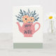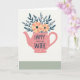 Designed with a cozy kitchen twist, the illustration centers on a rounded teapot in soft rose pink, dotted with small white circles that give it a sweet, retro look ❤️. The teapot is used like a vase, holding a bouquet that leans toward romance through its gentle, gathered shape, as if arranged for someone special. Two large flowers in warm peach and creamy yellow sit near the top, each with a deep indigo center that draws the eye. Around them, slim pointed leaves in muted teal spread outward in a relaxed fan, adding a calm, steady balance. The background is creamy off-white with a faint paper-like texture, keeping the scene soft and homey. A muted sage-green band runs along the lower portion, grounding the composition like a tabletop under the arrangement 🌼. The message “HAPPY MOTHER’S DAY WIFE” appears in dark teal across the middle of the teapot, centered and easy to read, with the letters standing out against the pink. The blossoms sit above the spout and lid, while the teal leaves arc outward toward the card’s edges.