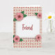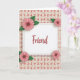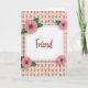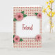 Designed with a white rectangular frame centered on the card, this illustration keeps the focus on a close, friendly connection. Inside the frame, the word “Friend” appears in deep rose lettering, placed neatly in the middle like a quiet note meant for someone dear ❤️. A thin outline and soft shading around the frame give it a slight lifted look against the background. In the corners, four pink daisy-like flowers with darker red centers and emerald green leaves lean inward, as if they’re gently gathering around the message. Two larger blooms sit along the left side, while two smaller ones peek in from the right edge, creating a balanced, cozy feel. Behind everything, a repeating pattern of pale apricot and cream geometric shapes adds a lace-like texture that feels warm and inviting 🌼. The flowers and frame cast faint shadows that make the layers stand out against the patterned backdrop.