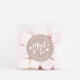 Punny wedding favor stickers feature "mint to be" in white hand lettered script accented with hearts, on a dusty rose pink taupe background. Personalize with your names and wedding date.