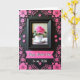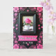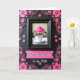 This card features a black-framed still life with a single fuchsia rose rising from a white teacup with a thin gold rim, resting on a matching saucer. Soft light inside the frame makes the petals look velvety and the green leaves feel freshly tucked in, like a small romantic gesture ❤️. Around the frame, a deep matte-black background is filled with raised-looking fuchsia flowers and curling vine shapes that wrap the center like an affectionate embrace. The floral border mixes larger open blooms with smaller textured florets, giving the edges a layered, garden-at-night feel 🌼. Below the framed image sits a pink ribbon-style banner that draws the eye downward. On the banner, the words “Happy Mother’s Day” appear in white flowing lettering, with “to my Wife” added nearby in smaller white text. The contrast of black, hot pink, and white makes the central rose and the banner stand out against the surrounding fuchsia swirls and blossoms.