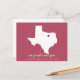 Modern and clean looking moving announcement in trendy color combinations. Personalize with your new address and other contact information, then move the dot on the state to show just where in Texas your new home is. Available in rose/celedon green/purple, green/cinnamon/coral, turquoise/hot pink/dark taupe. Matching flat cards and labels available.