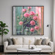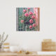 Artwork of some roses in a window. A charming still life painting featuring a bouquet of pink roses displayed in a transparent glass vase. The varying shades of pink in the blossoms, from soft blush to deeper rose, are rendered with delicate precision. Lush green leaves provide a vibrant contrast, while the window in the background hints at a tranquil indoor setting illuminated by gentle sunlight. This piece captures the ephemeral beauty of fresh flowers, making it a delightful addition to any art collection; adding a touch of warmth and peacefulness to any room. This artwork can be customized, printed, and or downloaded.