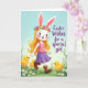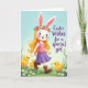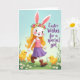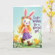 Designed with a springtime scene, this card features a cheerful bunny-like girl stepping forward with long golden hair, rosy cheeks, and tall ears reaching up, giving her a sweet, friendly look 🐰. A crown of pink roses and small white blossoms rests on her head, pairing nicely with a soft pink top and a flowing purple skirt. Near her feet, three fluffy yellow chicks gather close as if following along, their little cluster suggesting companionship and a gentle, affectionate bond 🐇. The main character sits slightly left of center, leaving open space on the right for a seasonal greeting. The greeting text appears on the right side in a flowing cursive style, set in a dark tone that stands out clearly against the light background. Behind everything, the backdrop fades from sky blue at the top into fresh green at the bottom like a meadow in early bloom. Small white flowers with golden centers dot the foreground in scattered patches, with soft lighting adding subtle highlights to the hair, petals, and feathers 🌷.