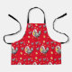 Great color and even though I ordered the kid size, it covers well enough to use during the holidays. I am not a big woman and prefer a shorter apron. I stand 5"6" and the length of the garment goes to mid-thigh. The tie straps fit well at my waist and even though there is no neck strap adjustment, the opening is plenty big enough. I am happy with the size and fit. I am sharing my apron with my 10 year old grandson, too! The color is vibrant and looks good, as shown on the website. The stitching looks strong and reinforced. Photographed is front side and back side of the apron, reinforced straps and coloring. My phone camera may not be the best at showing the details.
