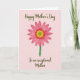 This design shows a large stylized flower centered on a soft blush-pink background, like a daisy with long rose-pink petals spreading outward. The petal tips soften into gentle gradients, giving the bloom a tender, affectionate look that feels like a quiet hug ❤️. In the middle, a bright green inner ring sits inside a wider sunny yellow band, dotted with small deep red accents that add texture. A single slim green stem drops straight down from the blossom, keeping the layout simple and calm. Near the top, a short greeting is placed in a loose handwritten style, colored deep olive so it stands out without feeling harsh. A second line of text sits below the flower in the same olive tone, spaced neatly to frame the illustration and add a friendly, caring note 🌼. The overall effect resembles watercolor with soft edges and slight variations in color, and the center disc shows tiny red specks around the yellow ring.