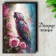 This striking portrait captures a majestic parrot in rich burgundy and indigo hues, set against a backdrop of sumptuous roses and ethereal atmosphere. The artwork demonstrates exceptional mastery in its portrayal of the bird's intricate plumage, which transitions from deep wine-colored neck feathers to metallic blue wing coverts, creating a mesmerizing interplay of warm and cool tones.
