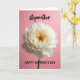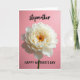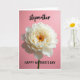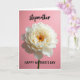 This greeting card features a full-bloom white flower centered in the frame, its many soft-edged petals opening like a gentle embrace that suggests affection and closeness ❤️. Light falls across the petals to show subtle cream and ivory shading, giving the bloom a calm, romantic glow. In the middle, a tight cluster of golden-orange stamens draws the eye and adds a warm contrast. The background is a smooth, soft rosy pink that feels tender and inviting, like a quiet moment shared between loved ones 🌼. A slender deep-green stem extends down from the flower and fades toward the lower area. Near the top, a short line of dark, flowing lettering names the recipient, set above the bloom and centered. Below the flower, a second line in darker, simple lettering announces the occasion, also centered and spaced to balance the layout. The rosy pink backdrop stays uniform with no extra patterns, keeping the white petals and golden center as the main visual focus.