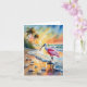 This greeting card features a watercolor portrait of a Roseate Spoonbill walking down the beach at sunset.