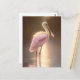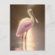 Roseate Spoonbill standing in water with warm light shining down on the pink bird.