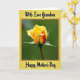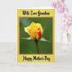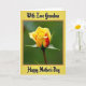 This card features a partially opened rosebud as the main focus, set against a softly blurred green background that feels calm and affectionate ❤️. The outer petals are a creamy yellow, gently shifting toward a warmer orange-red as they curl into the tightly layered center, like a quiet show of closeness. Small green sepals with lightly textured edges cradle the bloom, adding a protective, caring touch to the scene. Near the top, the words “With Love Grandma” appear in black decorative lettering, positioned above the flower. Near the bottom, “Happy Mother’s Day” is also printed in black, balanced beneath the rose for a neat, centered layout. A golden-yellow border frames the image, with a thin brown line just inside it to add contrast and structure 🌼. The rose is shown in sharp detail while the leafy background fades softly, and the border’s warm tones echo the yellow petals around the edges.