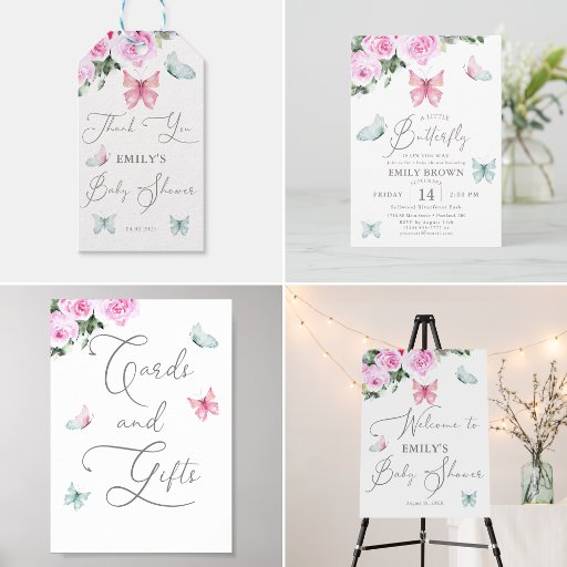 This elegant sign features a beautiful watercolor painting of pink roses and pink and mint butterflies, making it a perfect addition to any baby girl shower decor. The sign design includes the text "Cards and Gifts" to help guide guests to the designated area for placing their gifts and cards.