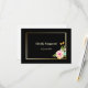 This wedding response card matches the Faux Glitter Gold Stripe Roses Wedding Invitations in our store. It features your custom text on a field of black, and enclosed within a thin shiny gold frame. A pink and peach rose embellishment decorates the bottom right. The back of the card has your custom text fields in black on a white background to make it easy for your respondent to mark.