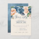 A bright, bold floral of roses in shades of dusty blue and peach is the focal point for many of the pieces of this wedding suite that also features elegant script text and modern design layouts. The wedding RSVP card shown here has an upper border of roses and a beautiful watercolor abstract on the reverse in dusty blue. Easily enter your wedding date and menu requirements using the provided template. Search ID584 to see all the matching pieces in this beautiful wedding set.