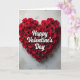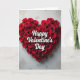 This card shows a heart shape made from many deep red roses, packed closely together so the petals look full and soft. The rose heart fills most of the front, and the flowers feel fresh and carefully arranged. Light falls gently across the petals, making some areas look darker and others glow a little, which adds depth. Behind the roses is an off-white background with a faint floral pattern that stays quiet so the red stands out. Across the middle of the rose heart, the words “Happy Valentine’s Day” appear in thin, flowing white lettering. The bright white text is easy to read against the dark red flowers and makes the message feel direct and loving. It’s a meaningful card to give because it says “I care about you” without needing a lot of extra words 🥰❤️. Hope it helps you share your Valentine’s Day sentiments with someone special.
