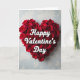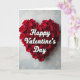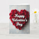 This Valentine's Day card shows a large heart made entirely of deep red roses, packed closely together so the petals look soft and layered. The flowers range from scarlet to darker burgundy, which gives the heart a rich, shaded look. Behind the roses is a cool blue-gray background with faint flower shapes that stay subtle and don’t distract. Across the front, the words “Happy Valentine’s Day” appear in white cursive lettering placed over the rose heart, easy to read against the dark reds. The lighting looks gentle and even, making the roses feel tender and inviting. It’s a meaningful card to give because the rose heart says “I care about you” without needing a lot of extra words 🥰. It works for romance or close friendship, and it’s a simple way to share Valentine’s Day feelings ❤️.