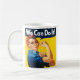 Lacking motivation? In need of a little girl power? Try this retro look Rosie the Riveter mug for size. The design on the mug features the iconic Rosie the Riveter, star of a vintage American WW2 poster, flexing her mighty muscles saying "We Can Do It!" to her sister Americans, as she urges them to work in factories to help the war effort. The famous poster by artist J Howard Miller shows Rosie dressed in her trademark blue overalls and red and white polkadot Forties' headscarf. There are two Rosies for the price of one on the mug - one with a solid blue background, the other with a blue gradient.