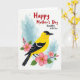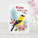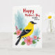 This card features a striking bird as the main focus, with canary-yellow feathers set against a deep black head, wings, and tail, and fine white lines tracing the wing details. Around it, rosy-pink flowers and rich green leaves cluster closely, as if the bird has nestled into a bouquet offered with quiet affection ❤️. The blossoms have small yellow centers that echo the bird’s bright body, creating a gentle, connected look across the artwork. Behind the scene, a soft aquamarine wash spreads lightly like sky haze, giving the whole setting an airy, calm mood that feels like a warm hug between family members 👩. Near the top, “Happy Mother’s Day” appears in warm crimson lettering, with “Daughter with love” placed just below in smaller matching text. The text sits centered above the illustration, leaving open white space that makes the colors stand out without feeling crowded. The bird faces slightly to the side among the flowers, framed by emerald leaves against the pale blue-and-white background.