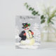Cute vintage Christmas artwork. Rosy cheeked fat snowman with red striped mittens, a black formal coat and black top hat with a band of holly and berries. Snow covered pine trees in the background.