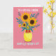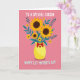 This design shows a rosy pink background with a cheerful bouquet arranged like a warm family hug ❤️. A sunny yellow vase sits in the center, tied with a red bow and marked with a small red heart that adds a tender, affectionate touch. Large golden flowers with deep brown centers spread outward, joined by smaller matching blooms that make the arrangement feel generous and welcoming. Slender teal leaves and sprigs weave between the petals, creating cool contrast and a gentle sense of closeness, like loved ones gathered around. The top line of text reads “TO A SPECIAL COUSIN” in rounded lettering, set clearly above the bouquet in a dark tone that stands out against the pink. Along the bottom, “HAPPY 1ST MOTHER’S DAY” appears in the same rounded style, centered beneath the vase for a balanced look 🌼. The illustration keeps shapes simple and flat, letting the warm yellows, reds, and teals carry the affectionate mood. A small crimson heart sits on the vase just below the bow, with teal foliage reaching up toward the top lettering.